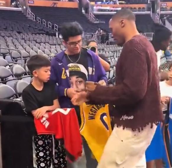 10月19日,在此前国王对阵湖人的比赛时,刚刚和球队签约的威少也出现在现场,有意思的是,场边有一群球衣带着威少不同球队时的球衣等待签名。